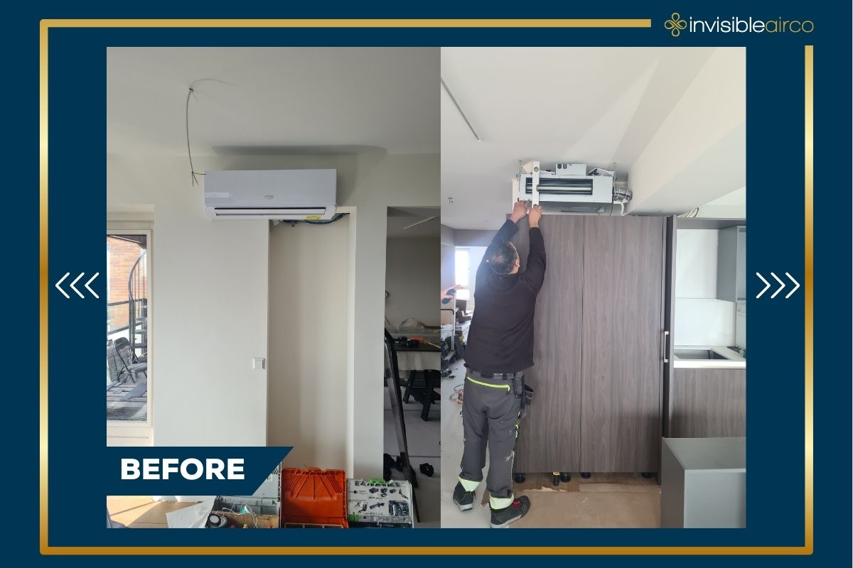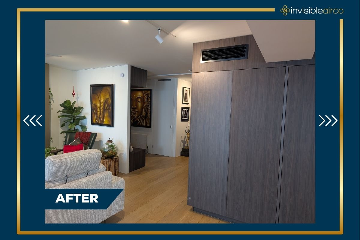 Samen met de interieurdesigner is gekozen voor een onzichtbare integratie van het systeem. De airco-units zijn weggewerkt achter maatwerkroosters in het meubilair, perfect afgestemd op het donkere hout en de strakke lijnen van het interieur. Waar zichtbaar plaatsen onvermijdelijk was, zijn de units discreet verwerkt met oog voor vorm en afwerking.